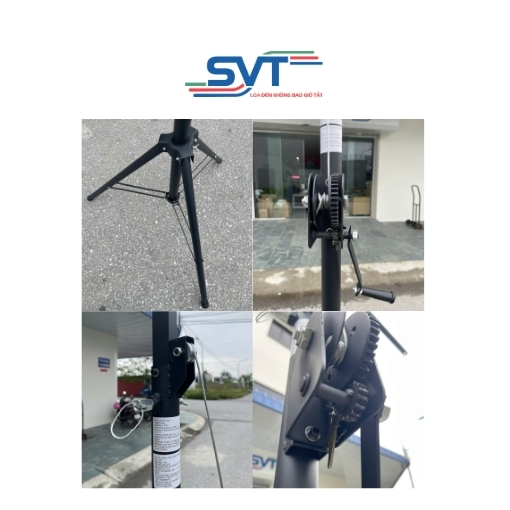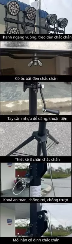 Điểm nổi bật của chân đèn là cơ chế tay quay nâng hạ linh hoạt, giúp điều chỉnh chiều cao thanh ngang dễ dàng, an toàn và tiết kiệm sức khi lắp đặt. Toàn bộ khung chân được làm từ kim loại cao cấp, phủ sơn tĩnh điện chống rỉ, đảm bảo độ bền bỉ cao khi sử dụng lâu dài, kể cả trong môi trường ngoài trời.
